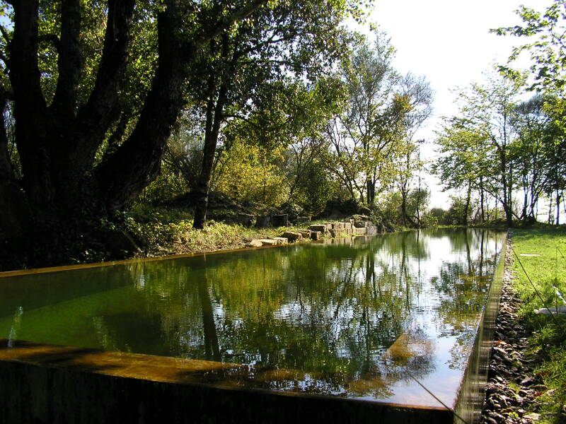 Le bassin ne cherche pas à se fondre dans les courbes du paysage. Il s’en distingue clairement, assumant pleinement son origine humaine.